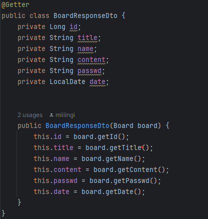 RequestDto와 유사하게 MappingJackson2HttpMessageConverter 클래스를 이용해서 ResponseDto 객체를 JSON으로 변환하게되는데, ResponseDto를 반환할때, getter를 이용해서 DTO 필드를 가져와서 JSON으로 만들어줍니다. 따라서, ResponseDto에서는 getter가 필요합니다.