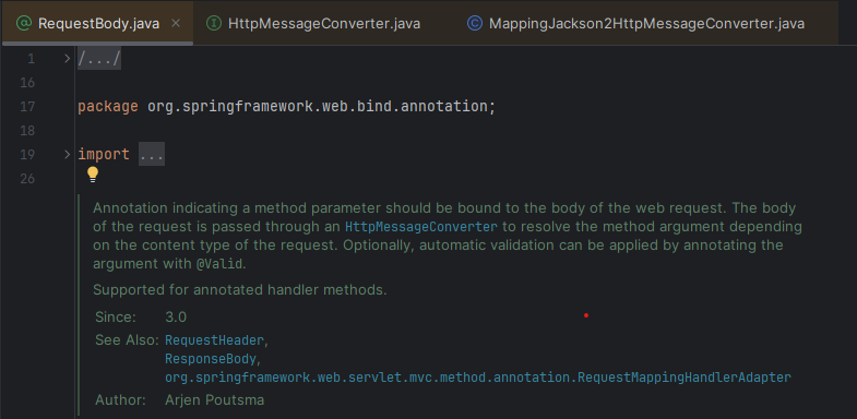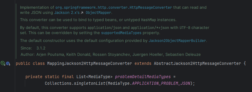이 인터페이스의 구현체 중 MappingJackson2HttpMessageConverter 클래스가 있습니다. 이 클래스는 Jackson 라이브러리의 클래스로써, ResponseDto, RequestDto, ResponseEntity와 같이 JSON 과 Java Object을 변환해주는 역할을 수행합니다.