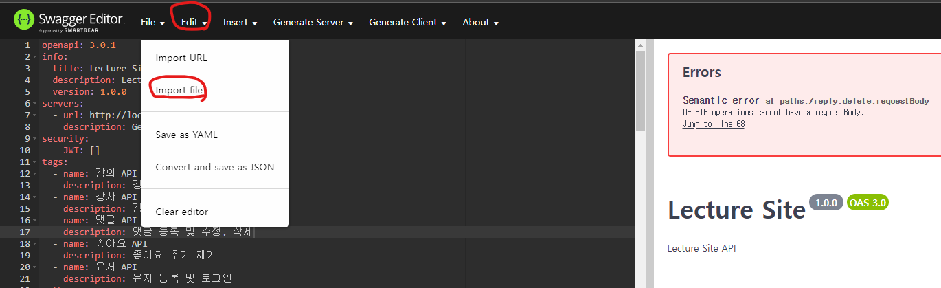 https://editor.swagger.io/로 접속해 방금 만든 json 파일을 import한다.