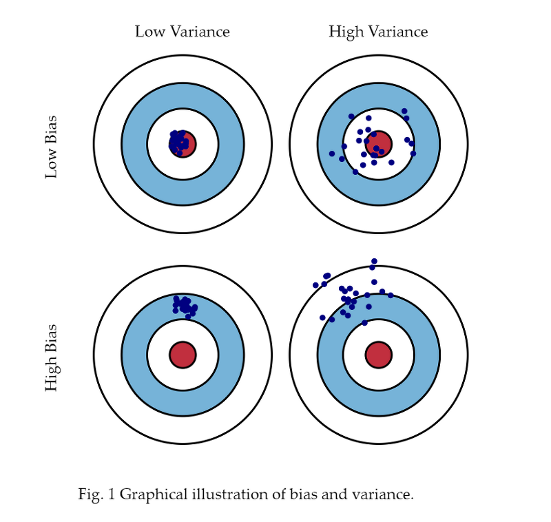 우리가 예측모델을 학습시킬 때, 왼쪽 상단의 모습처럼 분산도 낮고 편향도 낮은 모델을 학습시키는 것이 가장 이상적인 그림입니다. 하지만, 예측모델의 편향과 분산의 합은 정해져 있기 때문에, 둘 간의 절충 관계가 생기게 됩니다.