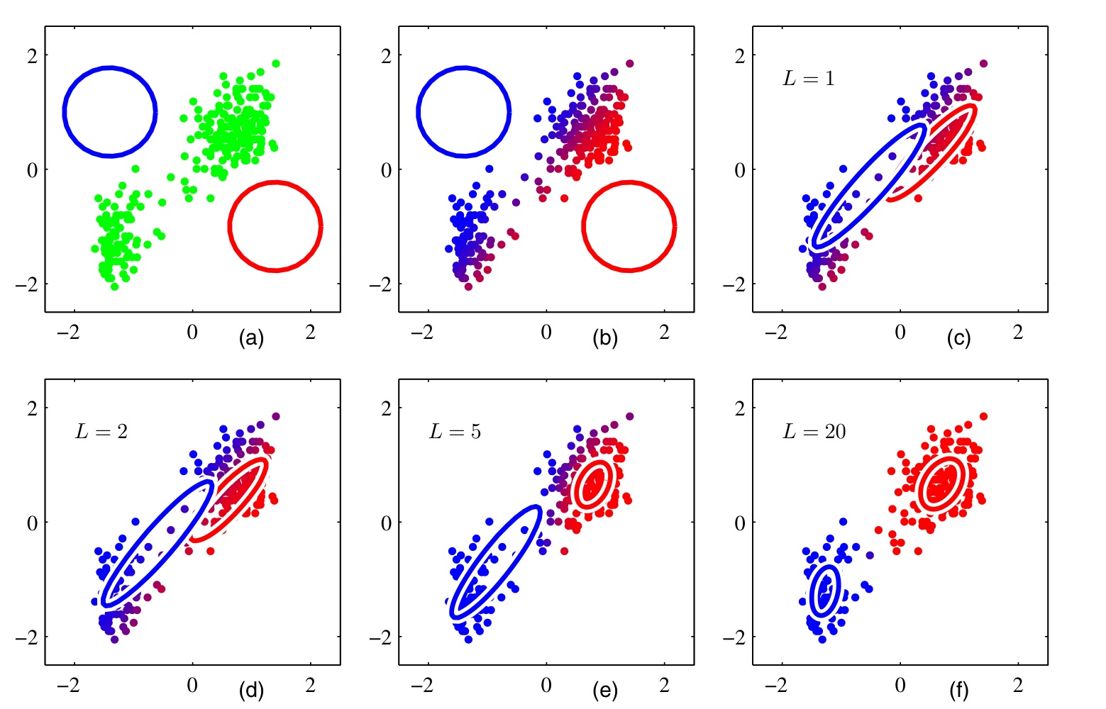 1. 과정에서 설정된 초기값을 통해, responsibility(2. 과정)를 계산하면 (b)와 같습니다. 그리고 responsibility를 통해 다시 모수를 갱신하여 나타내면 그림 (c)와 같습니다. 이 과정을 각각 2번, 5번, 20번 반복한 그림은 (d), (e), (f)와 같습니다.