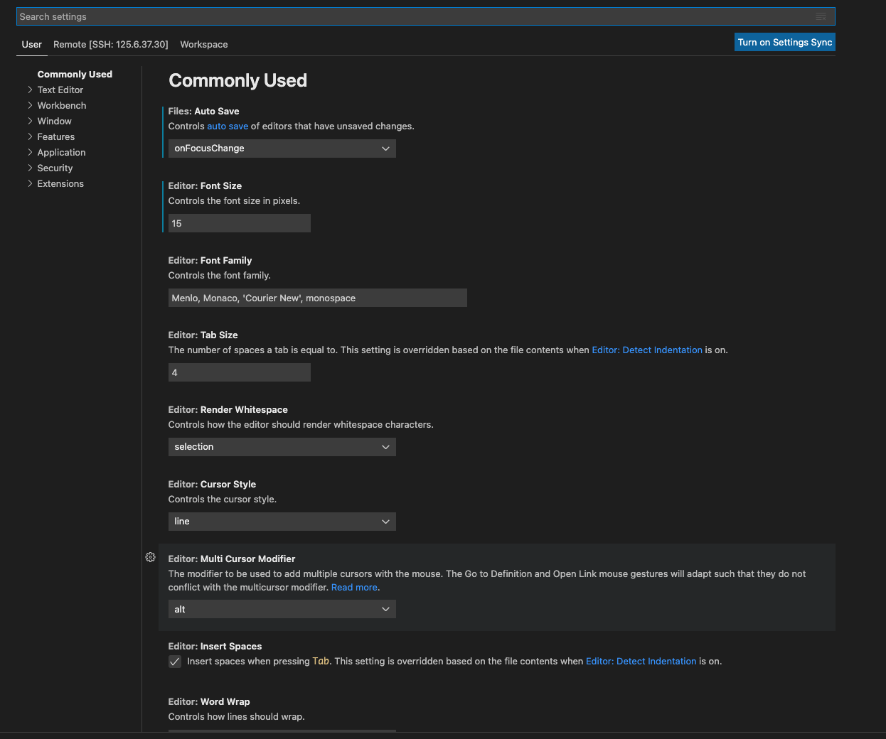 먼저 Setting 화면으로 이동합니다. 이동하는 방법은 "Cmd" + ","를 누르면 됩니다. 누르게 되면 아래와 같은 화면으로 이동합니다.
