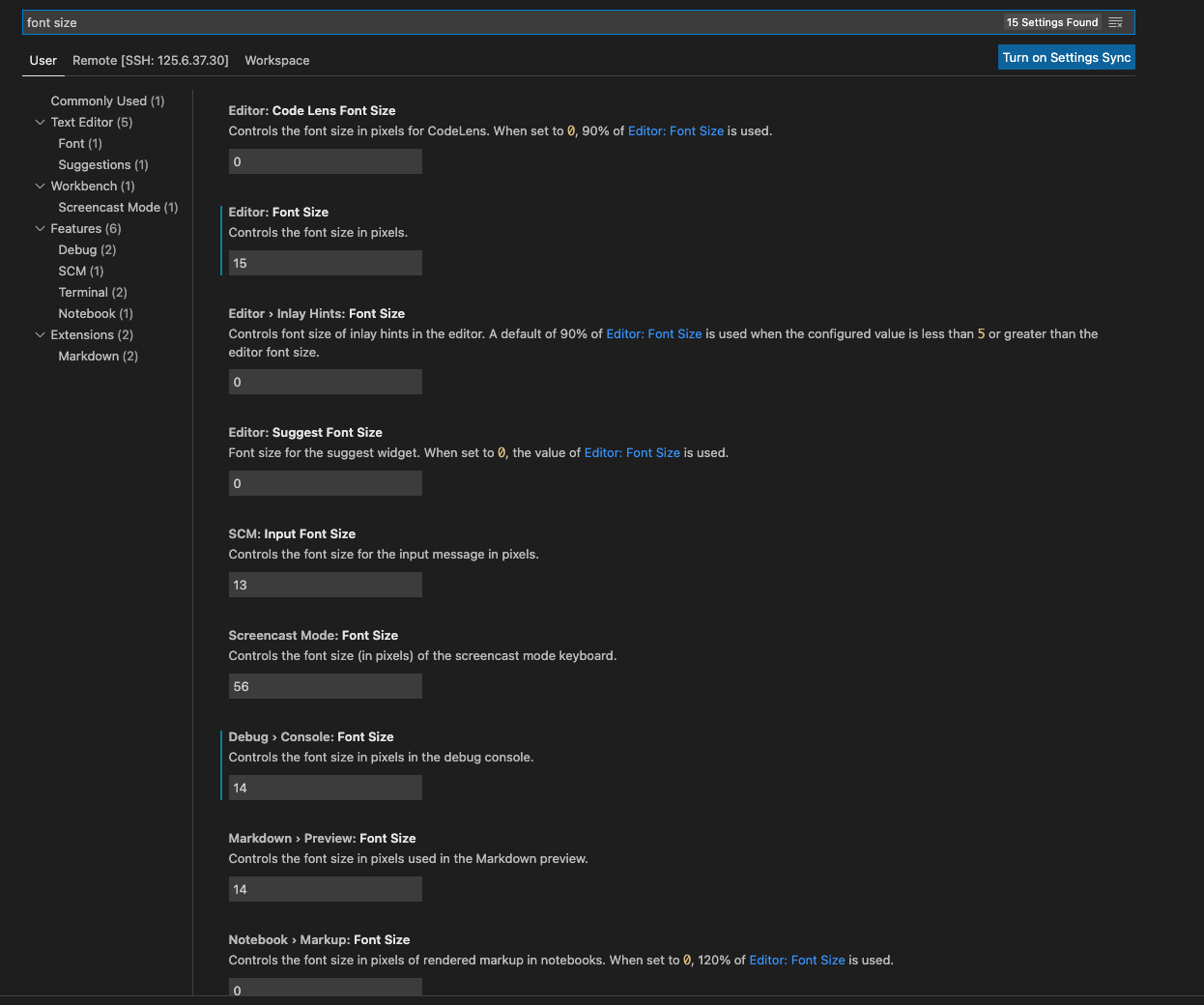 탐색창에서 "font size"라고 검색하게 되면, 아래와 같이 검색 결과가 나오게 되는데, 여러 종류의 font size를 조정할 수 있습니다!!