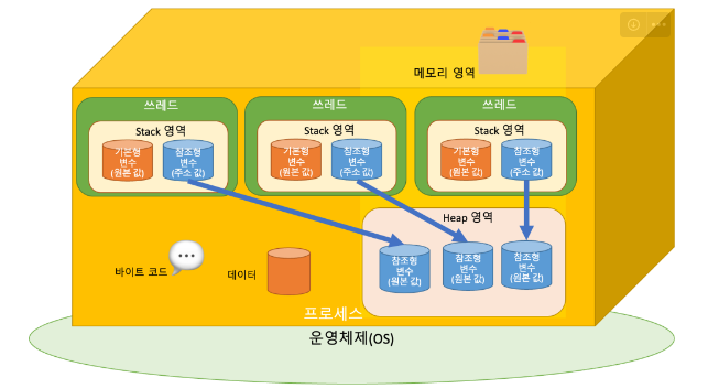 스레드들은 실행하기 위해 프로세스내의 주소 공간이나 메모리 공간(Heap)을 할당받습니다. 또한 각각의 명령처리를 위한 자신만의 메모리공간(Stack)도 할당받습니다. 위의 설명을 그림으로 나타내면 아래와 같습니다.