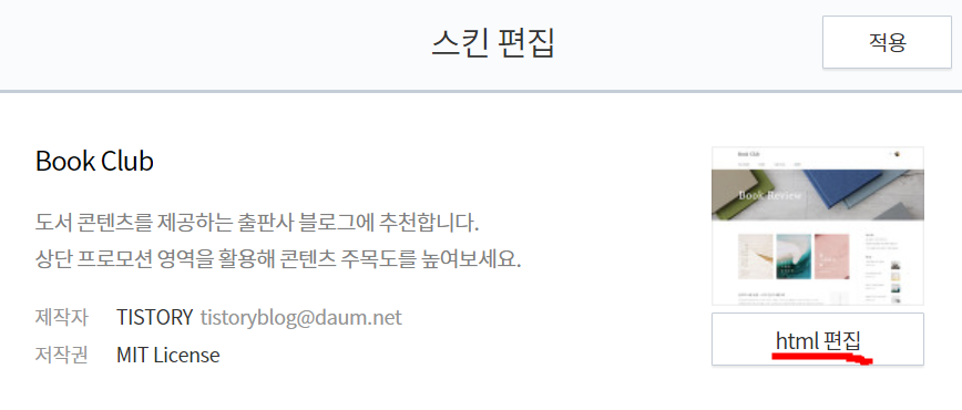 3. 스킨편집 탭으로 들어가서 HTML 편집 버튼을 누르기!